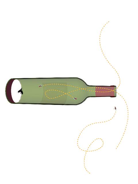 问题显然不在眼睛上。因为瓶底朝着窗户,蜜蜂便不停地在亮处寻找出口,却碰到蜜蜂怎么也弄不懂的玻璃,对阳光的敏感和执着使它们不肯到瓶口 —— 那个黑暗的出口去。是呀,黑暗与出口怎么能联系在一起。但是苍蝇可不管什么光明与黑暗,它们四下乱飞乱闯,瓶子又这么小,碰上瓶口的机会太多了,一群头脑简单、貌似全无所追求的苍蝇就这样获得了自由。