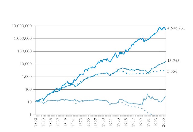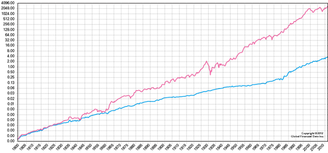 下面是 1800 年至 2012 年的股票和债券收益的收益比较图,红色是股票指数(SPXTRD),蓝色是债券指数(TRUSG 10M)。