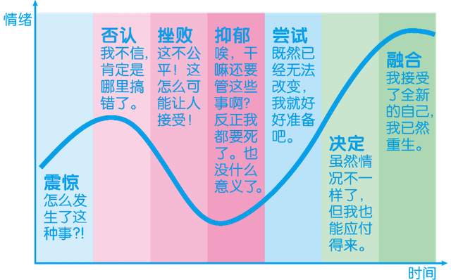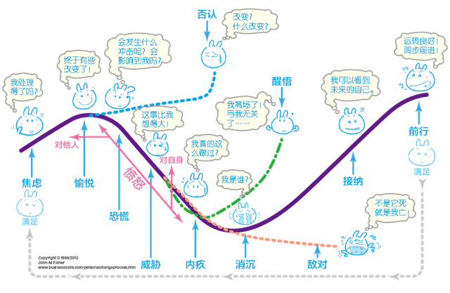 还有个“库伯勒 —— 罗丝改变曲线”(Kübler-Ross change curve)特别好玩,它看起来是这样的。